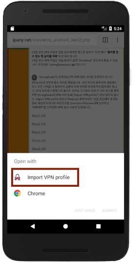 3 Import VPN profile 창이 자동으로 열리지 않는다면, StongSwan 앱을 실행하고 Profile을 가져올 수 있습니다.