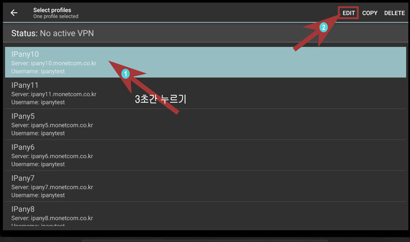 VPN 접속 아이디와 비밀번호를 잘못 입력하여 접속이되지 않는다면 수정할 Profile을 3초간 누르면 나타나는 Edit 버튼을 눌러 Username과 Password를 수정할 수 있습니다.