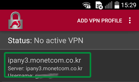 8 다음에 다시 접속을 원한다면 서버 등록 과정이 다시 필요하지 않습니다. StrongSwan 어플을 열고 단지 원하는 IPany 서버 프로파일을 눌러주어 간편하게 접속할 수 있습니다.
