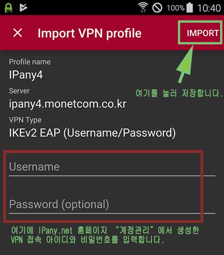 StrongSwan의 VPN 서버 등록(Import VPN profile) 창이 열리면, IPany 홈페이지의 계정 관리에서 생성한 아이디와 비밀번호를 Username/Password에 입력하고 "IMPORT"를 선택하면 VPN 접속 서버가 등록됩니다.