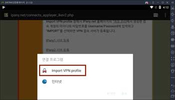 앱플레이어의 "인터넷" 엡에서 아래 서버 등록 링크를 클릭하면 StrongSwan이 실행되며 VPN 서버 등록("Import VPN profile") 창이 열리게 됩니다.