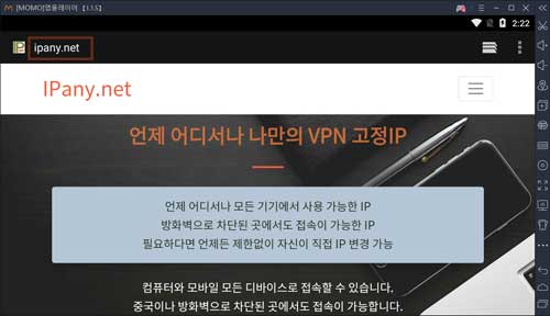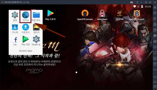 (모모앱플레이어의 "최근 앱" 버튼 클릭 후 "인터넷" 앱 선택)