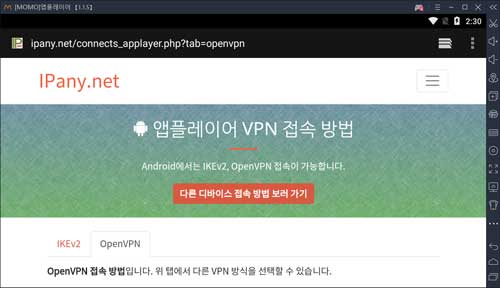 "접속방법" -> "앱플레이어에서 접속" -> "OpenVPN 방식"을 차레로 클릭하여 OpenVPN 접속방법 페이지로 이동합니다.
