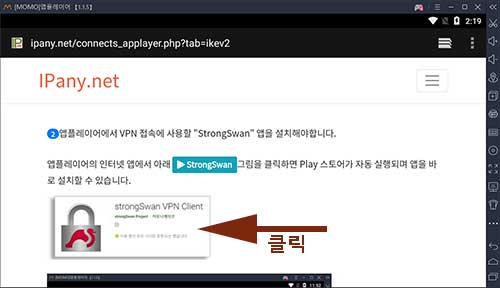 앱플레이어(블루스텍,녹스,LD,미뮤 등)에서 IKEv2 접속은 "StrongSwan"라는 어플을 이용합니다.