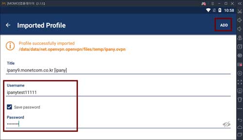 "Save password"를 선택하고 Username과 Password에 IPany 홈페이지의 계정 관리에서 생성한 아이디와 비밀번호를 입력하고 "ADD"를 눌러 저장합니다.