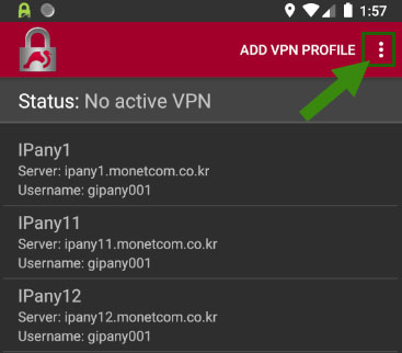 - StrongSwan 앱을 실행하고 오른쪽 상단의 "ADD VPN PROFILE"의 오른편의 메뉴 버튼을 눌러주고 "Import VPN profile"을 선택합니다.