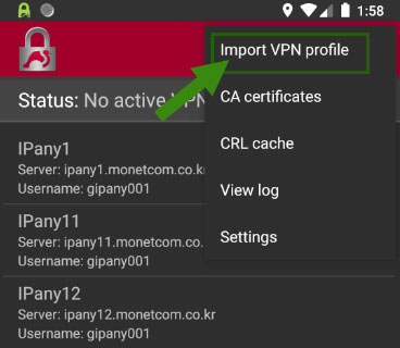 StongSwan 앱을 실행하고 Profile을 가져오는 방법입니다.