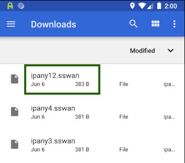 - 파일 선택 창이 열리면 Downloads에서 profile 파일을 찾아 선택합니다. profile 파일명은 "ipanyXX.sswan"입니다.