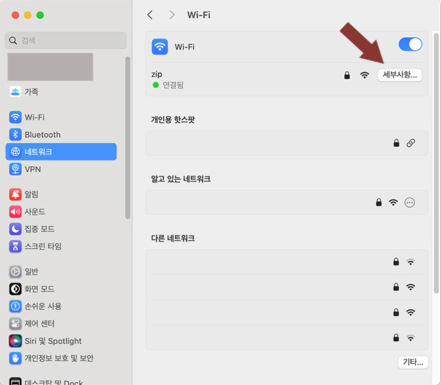 - 시스템 설정의 네트워크에서 인터넷에 연결된 이더넷 또는 Wi-Fi의 "세부사항"을 클릭합니다.