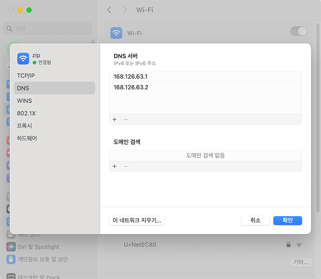 - 왼쪽에서 DNS를 선택하고 오른쪽 "DNS 서버"에서 기존 입력된 DNS 서버를 수정하거나 +(플러스)를 클릭하여 그림과 같이 한국 DNS 서버 주소를 입력합니다.