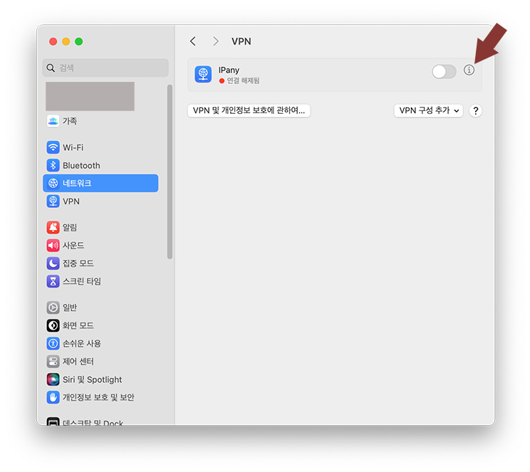 오른쪽에서 VPN 설정 옆의 정보 버튼