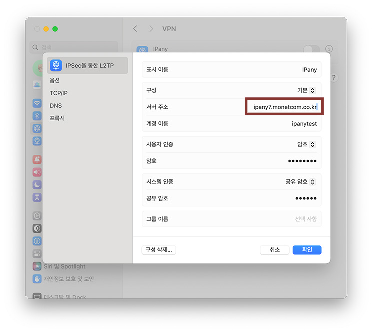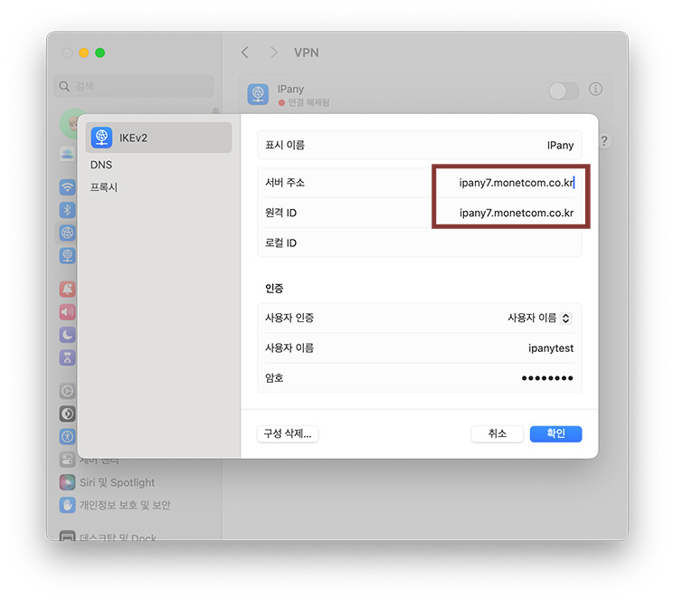 메뉴 막대의 VPN 상태 아이콘을 클릭하고 "네트워크 환경설정 열기"를 선택하여 아이디, 비밀번호, 서버주소를 변경할 수 있습니다. (비밀번호는 "인증 설정"에서 변경할 수 있습니다.)