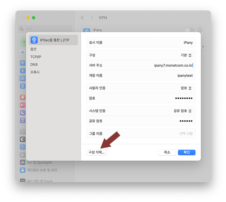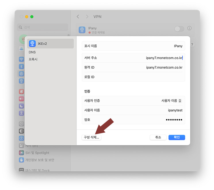 구성 삭제를 클릭하여 VPN 접속 설정을 삭제할 수 있습니다.