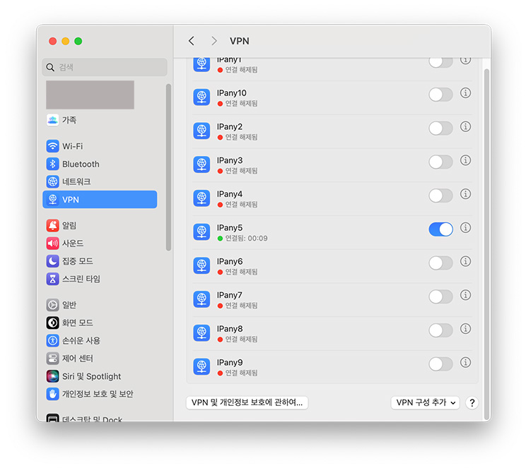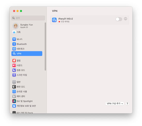 프로파일을 설치하면, VPN 설정이 생겨난 것을 확인할 수 있습니다.