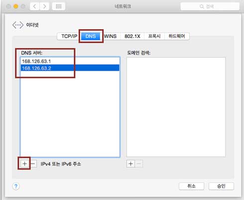 - DNS 탭에서 "DNS 서버" 창 아래의 +(플러스)를 클릭하고 그림과 같이 한국 DNS 서버 주소를 입력합니다.