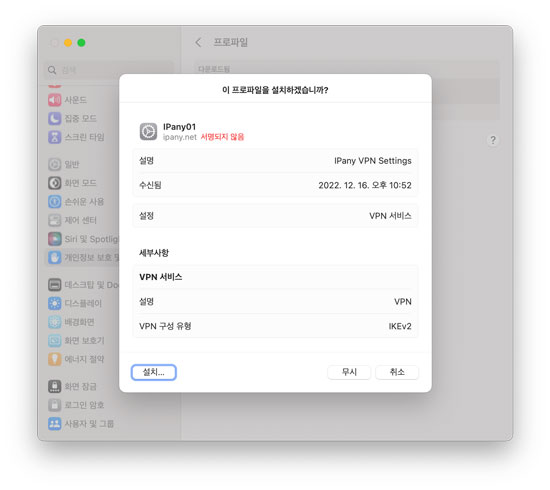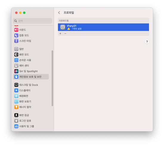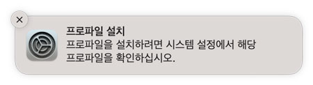 "시스템 설정 -> 개인정보 보호 및 보안"에서 프로파일을 설치합니다.