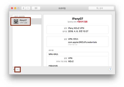 "시스템환경설정 -> 프로파일"에서 설치된 프로파일을 선택하고 삭제하면 VPN 접속 설정이 지워집니다.