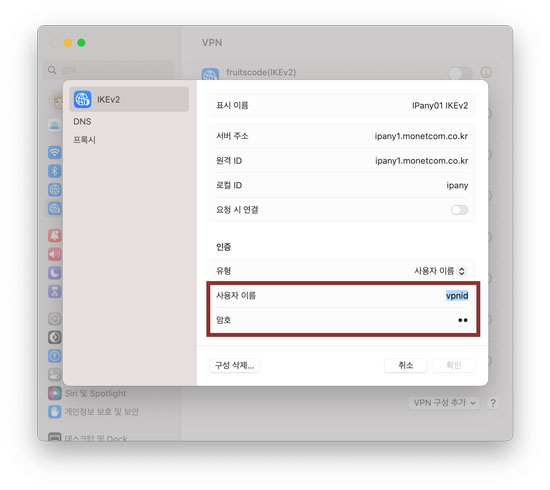 VPN 설정 옆의 정보 버튼(i)를 클릭한 후 "사용자 이름"과 "암호"에 VPN 접속 아이디와 비밀번호를 입력합니다.