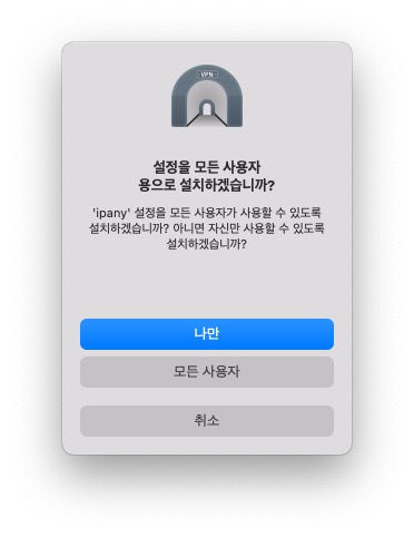 다운로드가 끝나면 "다운로드"에서 "ipany.ovpn"를 실행하고 이 설정을 사용할 사용자를 선택합니다. "모든 사용자" 또는 "나만"을 클릭하면 됩니다.