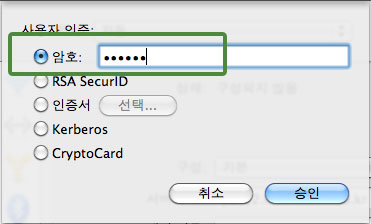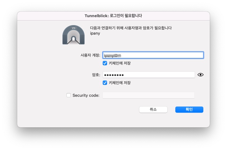 로그인 창이 열리면 IPany 홈페이지의 계정 관리에서 생성한 아이디와 비밀번호를 입력하고 "확인" 버튼을 클릭하면 접속됩니다. "키체인에 저장"를 선택하면 다음에 로그인 없이 바로 접속이 가능합니다.