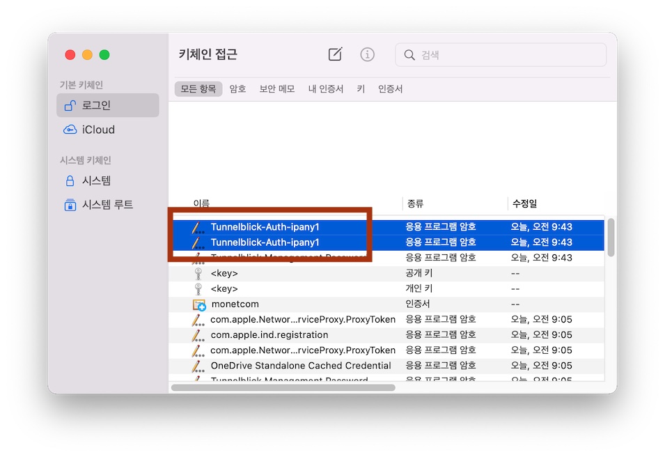 "키체인에 저장"을 선택한 후 아이디나 비밀번호를 수정해야 한다면, Command + Space (Spotlight 검색)에서 "키체인 접근"을 입력해 키체인 접근 창을 열어줍니다. Tunnelblick.Auth.ipany 두 개를 찾아 지워주면 VPN 접속 시 다시 아이디와 비밀번호를 입력할 수 있습니다.