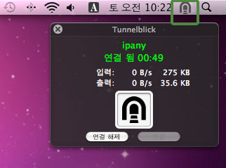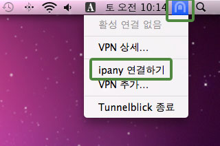 2 그림과 같이 메뉴 막대의 Tunnelblick 아이콘을 클릭하고 "ipanyS 연결하기"을 선택합니다.