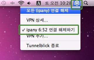 막대의 VPN 상태 아이콘을 클릭하고 "IPany 연결 해제"를 선택하면 접속이 끊어집니다.