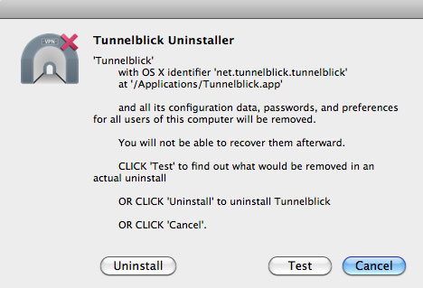 OpenVPN을 더이상 사용하지 않아 Tunnelblick을 제거하기 원한다면, 아래 다운받기를 클릭하여 Tunnelblick_Uninstaller 파일을 다운받고 실행하면 제거할 수 있습니다. Tunnelblick이 실행 중이라면 Uninstall하기 전에 먼저 종료해야 합니다.
