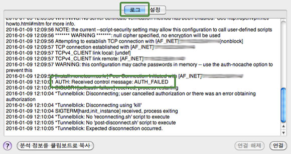 | AUTH: Received control message: AUTH_FAILED | Username 이나 Password를 잘못 입력하거나, 만기일이 지나거나, 이미 다른 기기나 컴퓨터에서 접속되어 있는 경우입니다. IPany 서비스는 같은 계정으로 동시에 이중 접속이 되지 않습니다. IPany 홈페이지의 계정 관리에서 계정 상태를 확인하세요. |