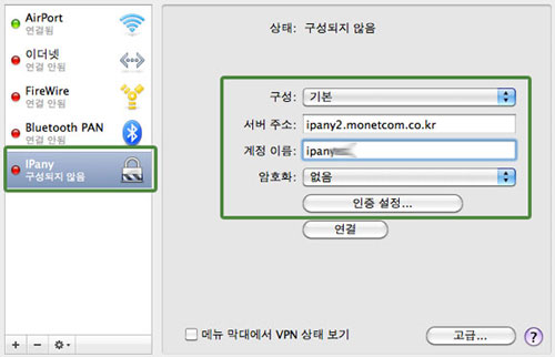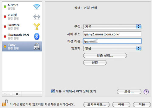 | 서버에 접속할 수 없습니다. | 서버 주소를 잘못 입력했거나, DNS 문제로 IPany VPN 서버를 찾지 못하는 경우입니다. 네트워크 설정에서 IPany VPN 연결의 서버주소를 확인합니다. 네트워크 설정에서 AirPort나 이더넷의 DNS 설정에서 DNS 서버 주소를 168.126.63.1로 변경해 주세요. |