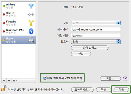 8 마지막으로 메뉴 막대에서 바로 VPN 접속이 가능하게 "메뉴 막대에서 VPN 상태 보기"를 선택하고 "적용"을 클릭합니다.