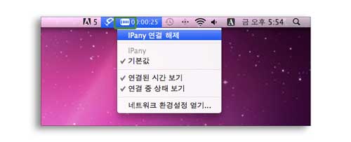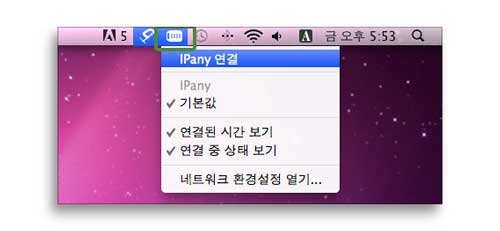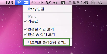 그림과 같이 메뉴 막대의 VPN 상태 아이콘을 클릭하고 "IPany 연결"을 선택하면 접속됩니다.